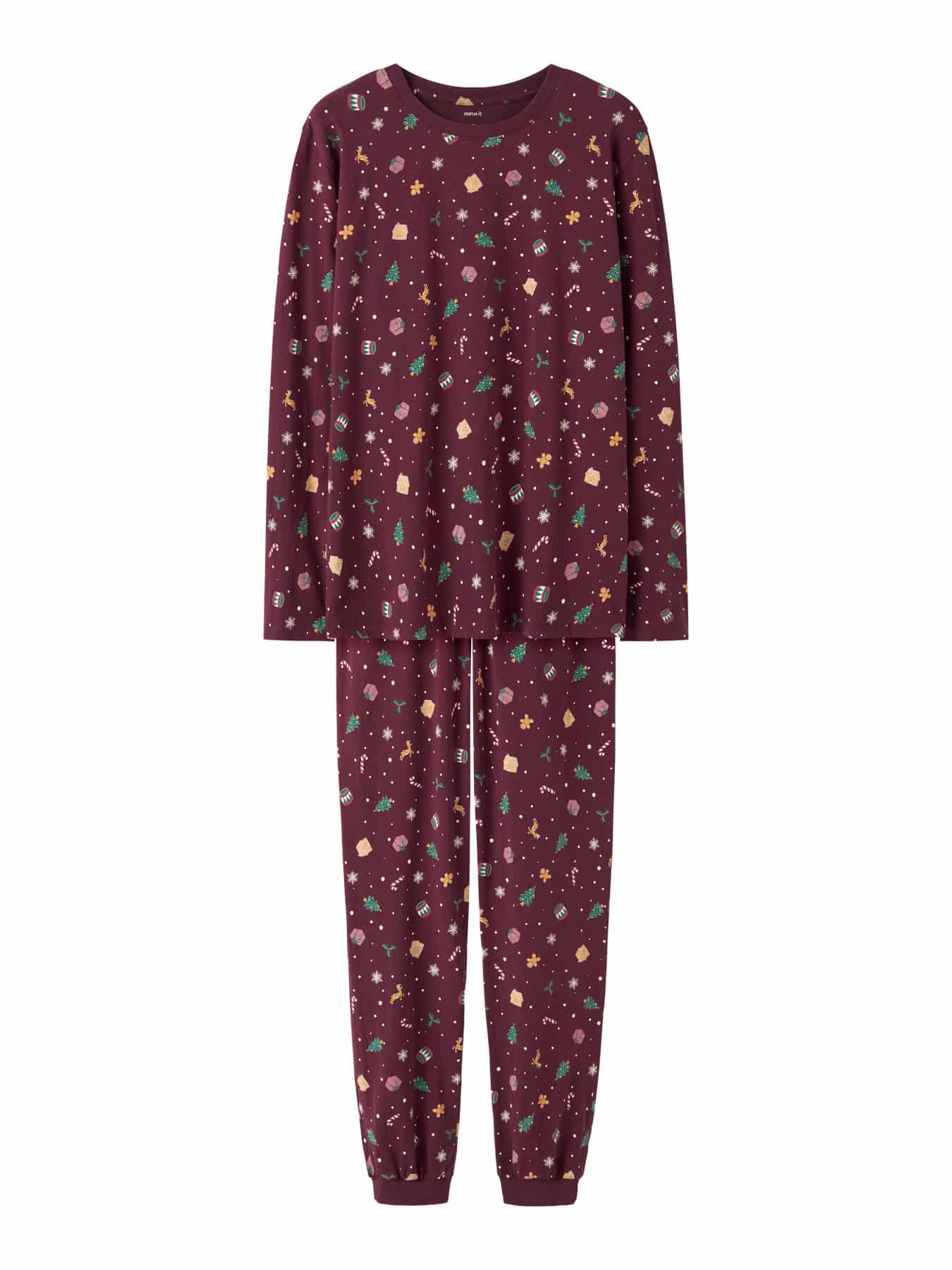 Mega fint jule natsæt fra Name it med bukser og bluse. Sættet er i flot bordeaux farve med skønt print af forskellige juleting. Blusen er med lange ærmer og sættet er unisex.